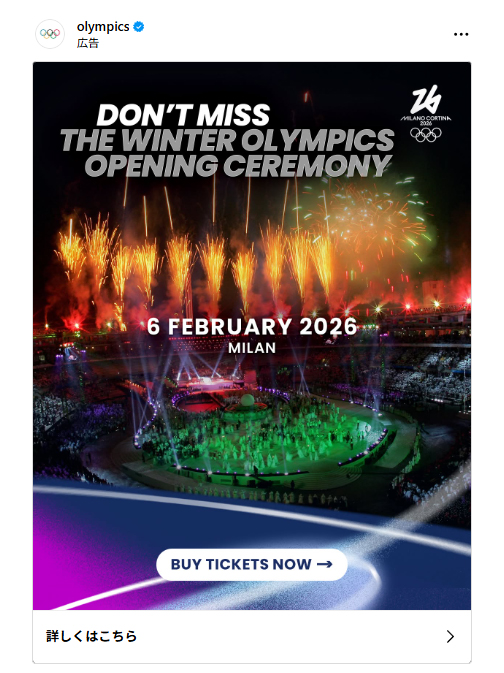 IOCの公式Instagram(@olympics)でも「DON’T MISS THE WINTER OLUMPICS OPENING CEREMONY」と題した広告が展開され、世界中のファンに向けて“観客席でその瞬間を体感しよう”と呼びかけている。