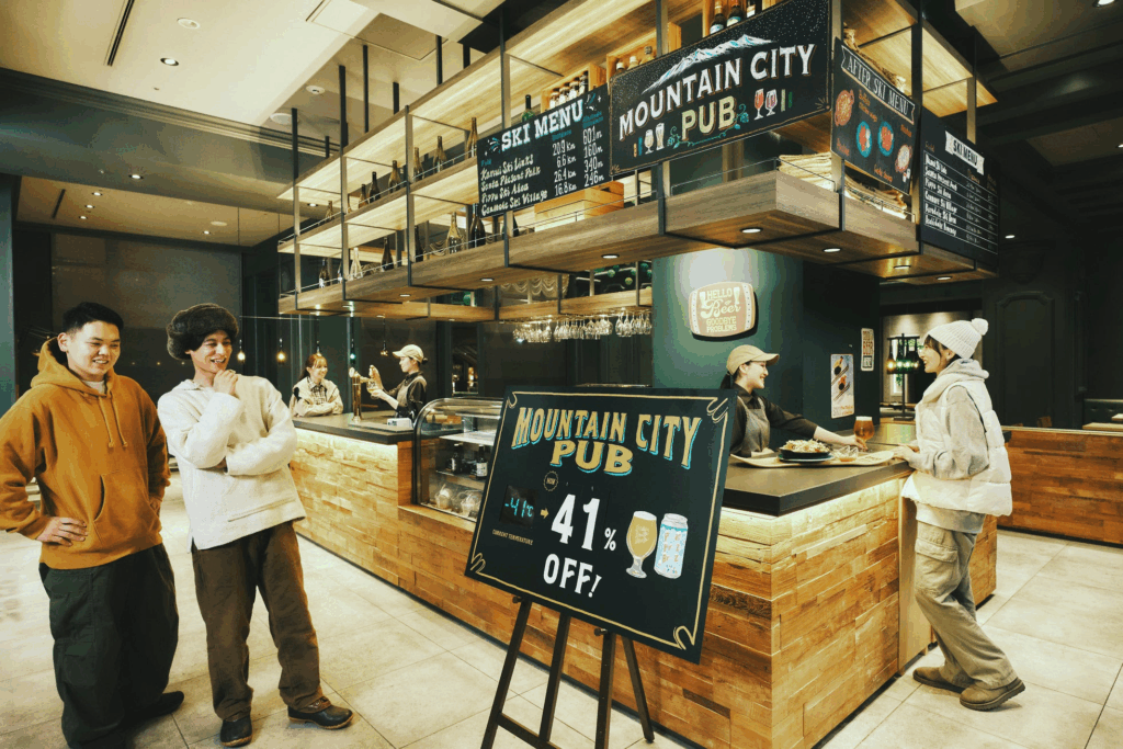 また、アフタースキーに気軽に立ち寄れる「マウンテンシティパブ」では、旭川のクラフトビール専門店「-Freehouse- THE YEAST」と共同開発したオリジナルクラフト生ビール「Please Freeze Breeze」を販売。外気温が低いほど価格が下がるというユニークな仕組みで、アフタースキーを一層盛り上げます。
