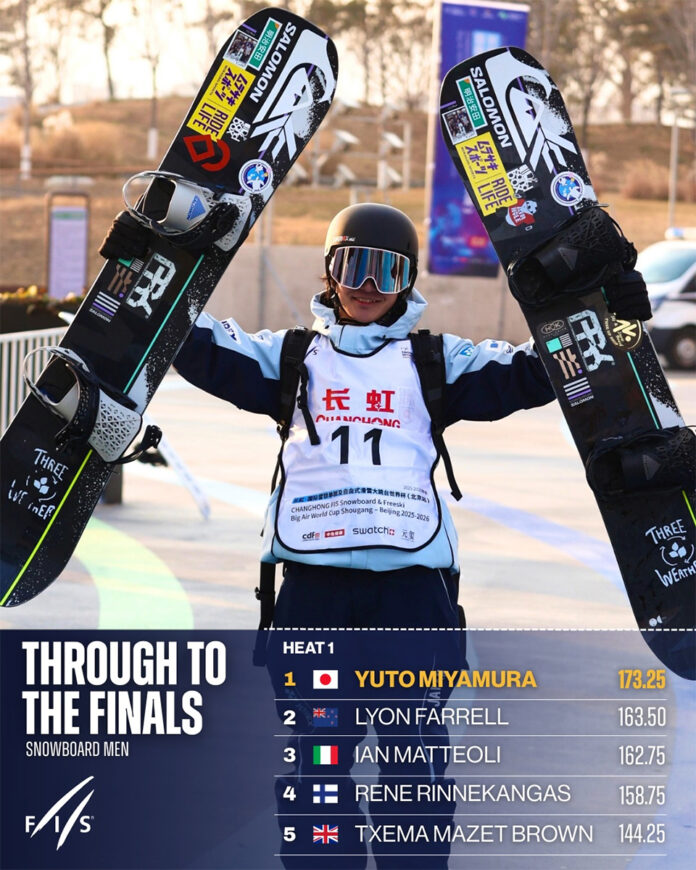 スノーボードのワールドカップ(W杯)ビッグエア第2戦は5日、北京で予選が行われ、男子では宮村結斗が予選1組を1位で突破し、上位10名が進む決勝へ進出した。続いて木村葵来も2組4位に入り、男子は2名が決勝に名を連ねた。