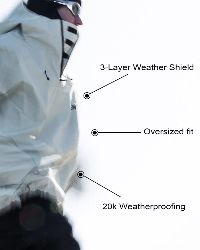 20,000mmの防風・防水性能に加え、通気性も兼ね備え、長時間の着用でも快適。オーバーサイズ設計でコートの上からでも簡単に羽織れる。さらに、バイザー付きのヘルメット対応フードがしっかりカバーし、過酷な環境でも動きやすさを損なわない。