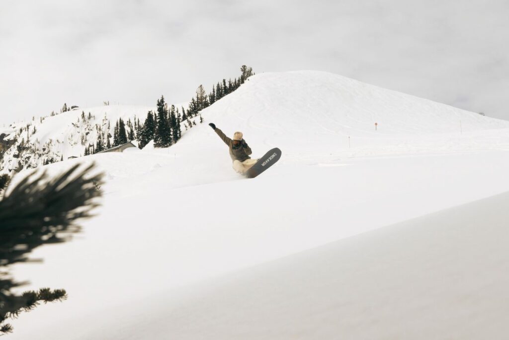 「パウダー用の板ですが、毎日のスノーボードにも使っています。今年はこれしか乗っていません」と亮。意外にもピステンでも乗りやすく、オーリーやターンもスムーズに決まります。