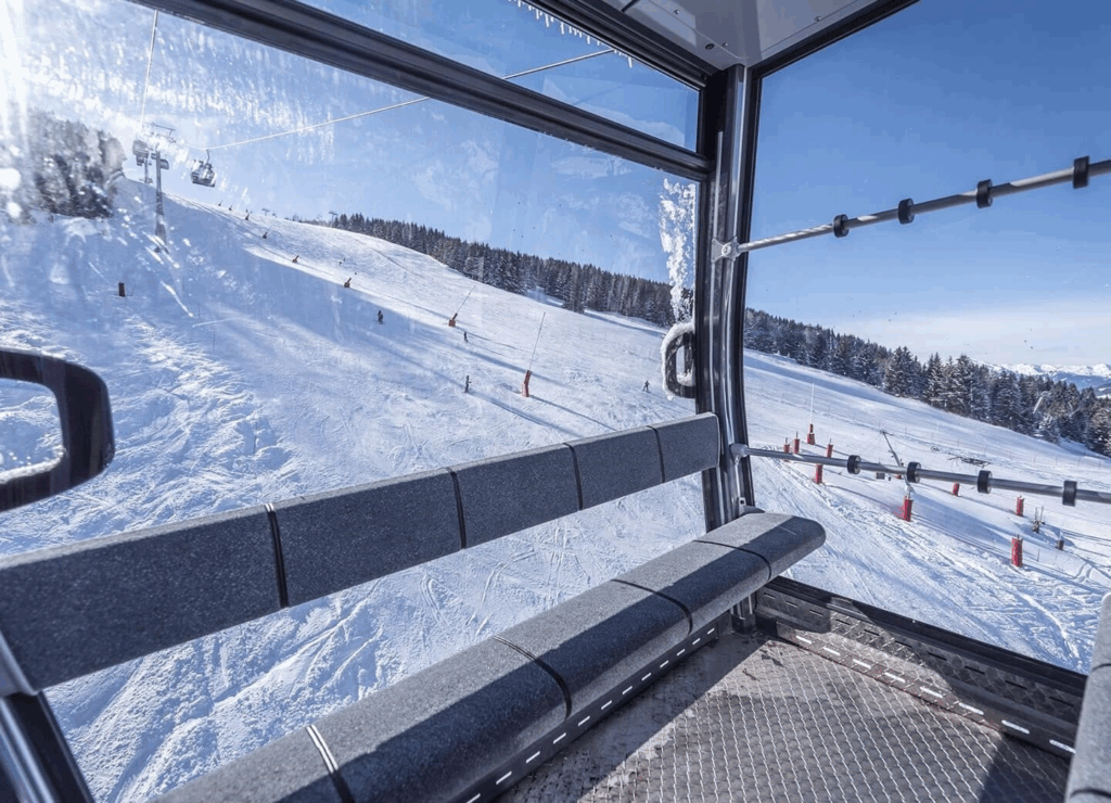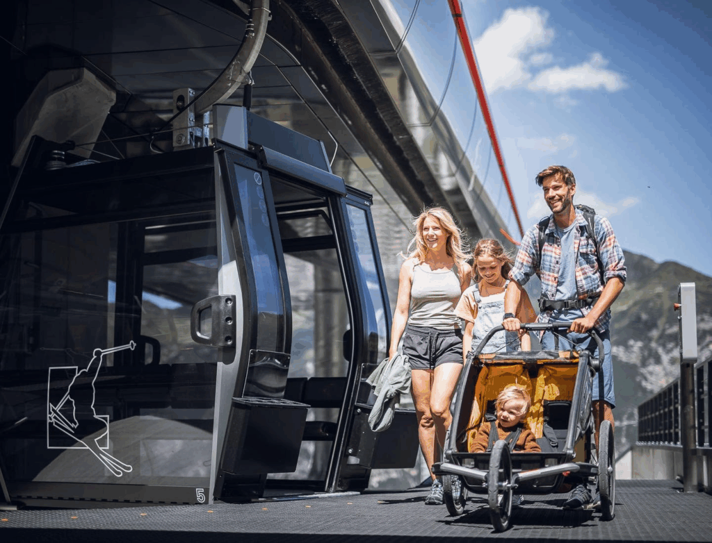 そしてゴンドラ搬器は、日本初導入となる同社製の最新モデル「B-03 EVO キャビン」を採用。搬器は1台に10人が乗車可能な大型搬器となり、四面とも強化樹脂ガラスに覆われることで、搬器内空間の快適性を大幅に改善します。全方位360°のパノラマビューが可能となることで、北アルプスの雄大な絶景を心ゆくまでご堪能いただけます。さらに、バリアフリー対応を進め、乗降場床上と搬器に段差が生じないユニバーサルデザインを採用し、どなたでも快適にご利用いただける設計となります。