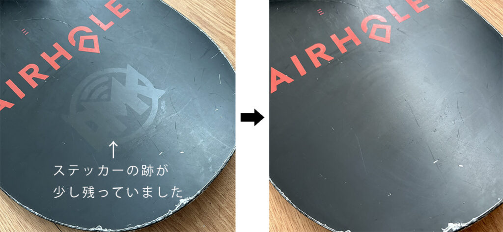 剥がしてみると、ステッカーの跡が少し残っていたので、濡れた雑巾で拭いてキレイにしました。ベタつきが強い場合は、アルコールシートを使うとよりスッキリします。
