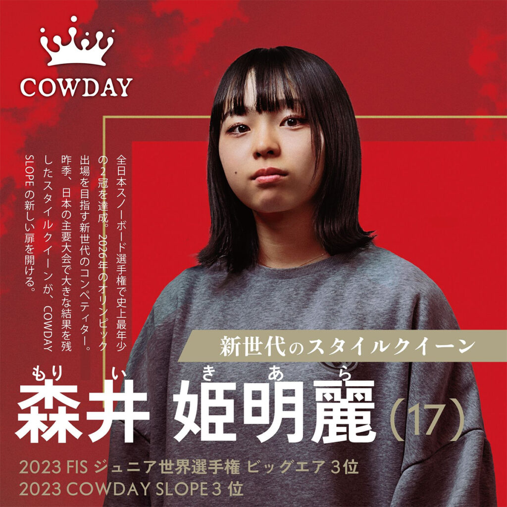全日本スノーボード選手権で史上最年少の2冠を達成。2026年のオリンピック出場を目指す新世代のコンペティター。昨季、日本の主要大会で大きな結果を残したスタイルクイーンがCOWDAY SLOPEの新しい扉を開ける。