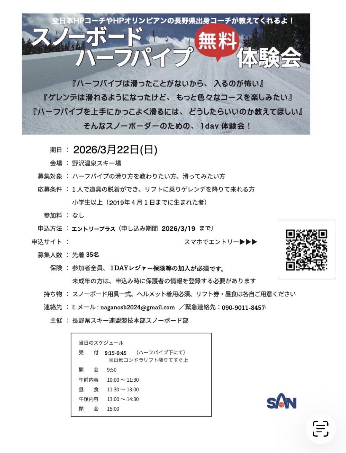 スノーボードハーフパイプ無料体験会@野沢温泉スキー場