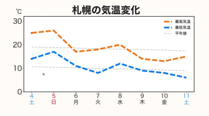 札幌では、日中の気温が平年より上下を繰り返しながらも、徐々に秋が深まっていく見込み。