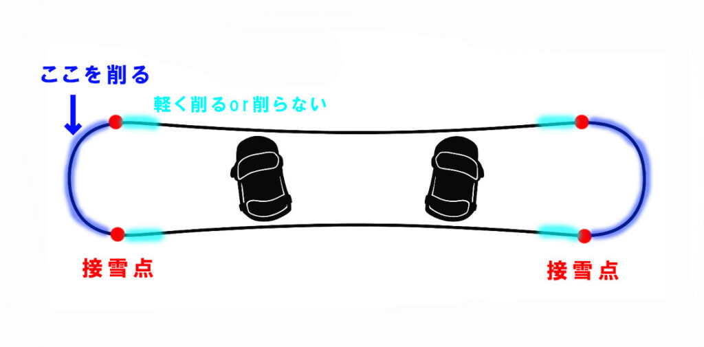 ダリングが必要な箇所は、ボードの先端や後端など、雪面に接触しない部分です。特にボードの先端とテール先端は、ダイヤモンドファイル(または細めのやすり)で軽く削っても問題ありません(上のイラストの青い部分を参照)。