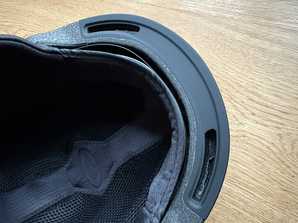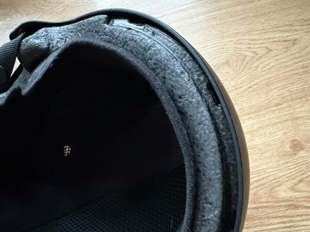 見た目は頑丈そうに見えても、ヘルメット内部の構造は、一度衝撃を受けると保護能力が大きく損なわれます。ジャンプや滑走中のクラッシュで頭を守った場合、外側に傷や変形がなくても、内部の衝撃吸収構造(EPSフォームなど)はダメージを受けている可能性があります。