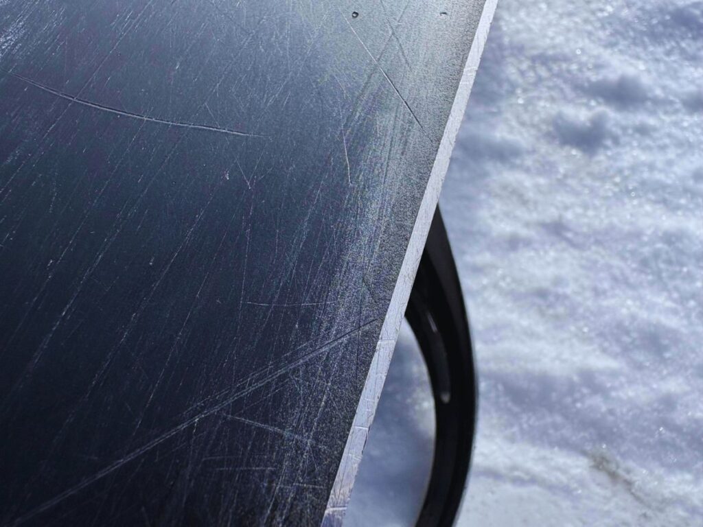 長らくワックスをかけていない滑走面は、エッジ付近から毛羽立ちが目立ち、いかにも滑らなさそうな状態です。