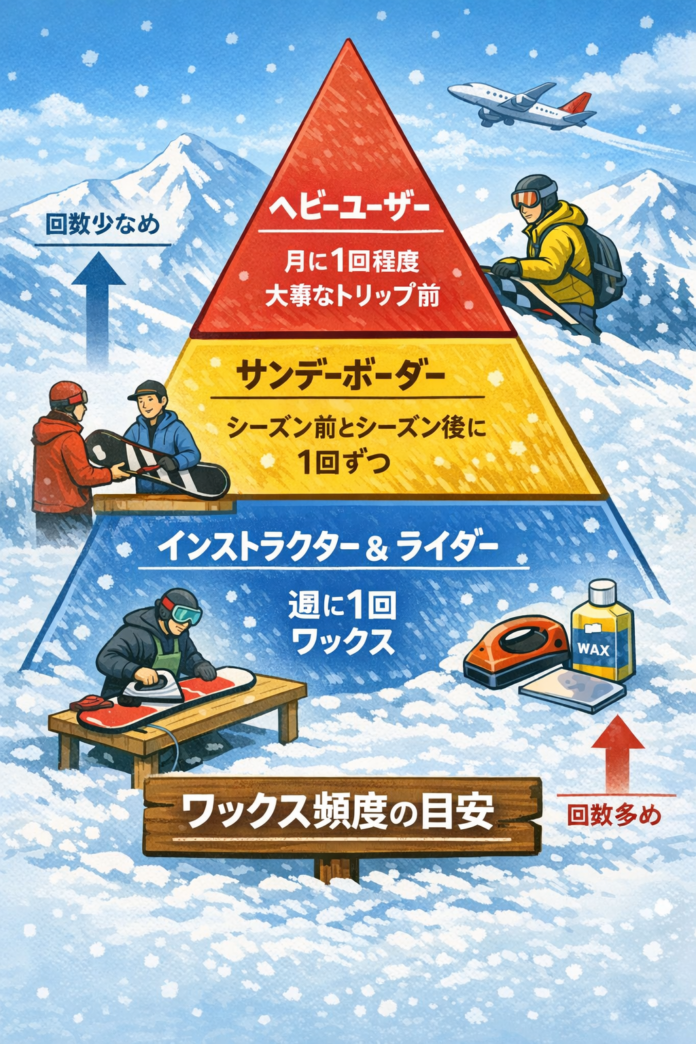 ワックスの頻度やタイミングは、滑る環境や頻度によって変わります。
