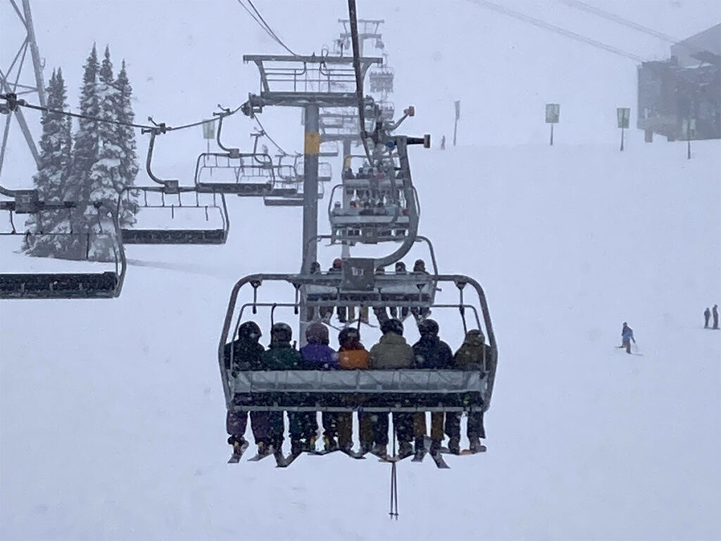 (昨シーズン、私が見た超驚きの光景。なんと6人乗りのチェアに、7人も乗っているのです!高速チェアならではのアクシデント。)